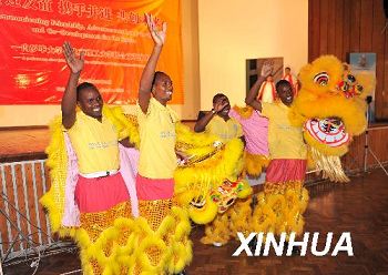 10月12日,在肯尼亞首都內(nèi)羅畢,4名內(nèi)羅畢大學(xué)孔子學(xué)院的學(xué)生在聯(lián)歡會(huì)上表演中國舞獅。當(dāng)天,200多名來自北京理工大學(xué)、內(nèi)羅畢大學(xué)孔子學(xué)院和津巴布韋大學(xué)孔子學(xué)院的大學(xué)生們?cè)趦?nèi)羅畢大學(xué)舉行聯(lián)歡會(huì),同學(xué)們以合唱、舞蹈等精彩的節(jié)目交流情感傳遞友誼。(新華社/徐速繪 攝)