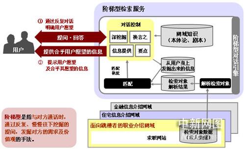 沖電氣與RECRUIT,共同開發(fā)設(shè)計了通過計算機向用戶提問,發(fā)掘用戶獨自無法表達(dá)的愿望及需求,從各種各樣大量的服務(wù)及內(nèi)容中找出與之匹配信息的“階梯型檢索服務(wù)”。去年本服務(wù)已經(jīng)被“信息大航海項目”作為模型服務(wù)之一所采納,進(jìn)行了圍繞階梯型對話引擎的系統(tǒng)技術(shù)開發(fā),在以約800用戶為對象的向跳槽者介紹職業(yè)的網(wǎng)域進(jìn)行了驗證試驗。結(jié)果表明,與用戶平均進(jìn)行了33次對話(系統(tǒng)提問,用戶回答后算一次對話),可以平均從用戶獲得32個屬性的信息。同時進(jìn)行了問卷調(diào)查,24%的用戶回答通過對話得到了提示,了解了自己的需求,驗證了通過與計算機對話,能發(fā)掘用戶自身沒有注意的需求。而且,沖電氣還從中獲知可以對該服務(wù)寄予極大期望,期待目前有54%,兩年后有75%的用戶能使用該服務(wù)。
