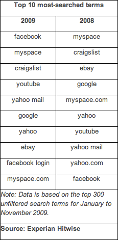 2008年,F(xiàn)acebook在該排行榜的排名僅為第10,而今年卻一舉超越去年的冠軍Myspace,成為最流行的搜索關(guān)鍵詞,Myspace退居第二。