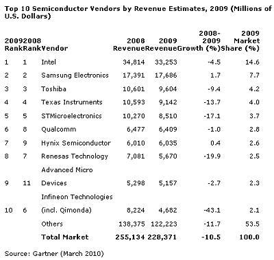 此外,三星排名第二,市場(chǎng)份額為7.7%。東芝第三,市場(chǎng)份額為4.2%。德儀第四,市場(chǎng)份額為7%。意法半導(dǎo)體第五,市場(chǎng)份額為3.7%。與2008年相比,前五位排名未發(fā)生任何變化。