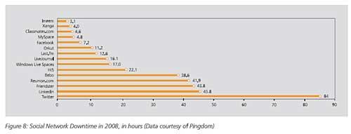 Twitter去年宕機(jī)時(shí)間至少是其競(jìng)爭(zhēng)對(duì)手的2倍,其2008年的總宕機(jī)時(shí)間為84小時(shí),排名首位。
