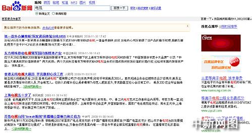 而百度則將通過聚合各家新聞機(jī)構(gòu)的內(nèi)容獲得的流量轉(zhuǎn)化成了自己的廣告價(jià)值。在百度新聞搜索中搜索“電視”后,除了各家新聞網(wǎng)站關(guān)于電視的相關(guān)新聞外,還會(huì)在頁面右側(cè)看到多家電視廠商的廣告(下圖)。而通過這些廣告獲得的收入,百度顯然不會(huì)與提供內(nèi)容的新聞單位分成。