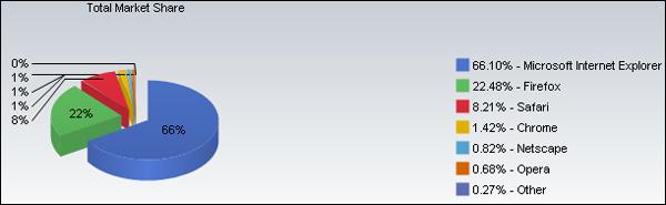 NetApplications上公布的統(tǒng)計(jì)數(shù)據(jù)顯示,今年4月IE的份額為66.1%,火狐為22.48%,蘋果Safari為8.21%,Chrome為1.42%。數(shù)年前,微軟IE市場份額曾高達(dá)90%以上,但近年來隨著火狐、蘋果Safari及谷歌Chrome等瀏覽器的崛起,微軟IE市場份額一直呈下降趨勢。
