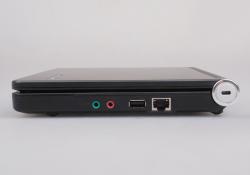 昭陽M10的機身側面接口比較簡單,但也涵蓋了基本的使用需求。機身前端沒有設置任何功能接口,不過內置了一組雙聲道立體聲音響,在閑暇時放上一段舒心的音樂也是不錯的選擇。機身右側設置了一對音頻I/O接口、一枚USB2.0接口、一枚RJ45網(wǎng)絡接口以及轉軸上的安全鎖孔,左側除電源插孔外還加入了VGA視頻接口、SD讀卡器以及USB2.0接口,足以滿足外接存儲設備或顯示設備的需要。