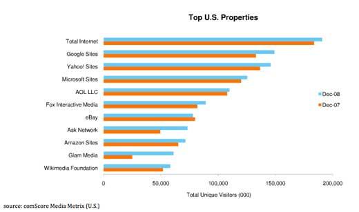 約翰·多納霍(John Donahoe)2008年一季度執(zhí)掌eBay后提倡“大幅更換產(chǎn)品、消費方式和業(yè)務(wù)模式”,在與亞馬遜和谷歌的失敗競爭中,eBay領(lǐng)導(dǎo)層徹底放棄了殘存的娛樂元素。2008年12月,eBay占網(wǎng)民網(wǎng)絡(luò)瀏覽時長比率僅為1.5%。按獨立訪問者數(shù)量排名,靠前的網(wǎng)站分別是谷歌(YouTube母公司)、?怂够觽髅(MySpace母公司)等,eBay僅列第六位,與2007年12月數(shù)據(jù)相比,是十大網(wǎng)站中唯一出現(xiàn)排名下滑的網(wǎng)站。(見圖)