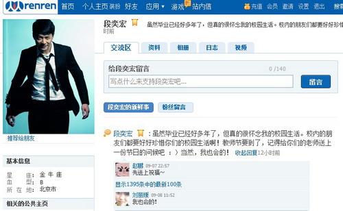 人人網(wǎng)明星主頁上的眾多明星們:光良、尚雯婕、游鴻明、段奕宏、王寶強等,還有世界小姐張梓琳和王靜瑤以及以那多為代表的新一代年輕作家都紛紛更新自己的狀態(tài)表示對恩師的問候,有的明星還在主頁上講述自己學生時代的趣事,而機構(gòu)主頁中的《環(huán)球時報》和光線傳媒《最佳現(xiàn)場》等也是在主頁上更新了教師節(jié)狀態(tài)以此表示對老師們的敬意。從電話、短信、電子郵件,表達祝福的方式在不斷演進,當前社交網(wǎng)站因其基于真實用戶而產(chǎn)生的真實情感,成為人們表達祝福的最新選擇。