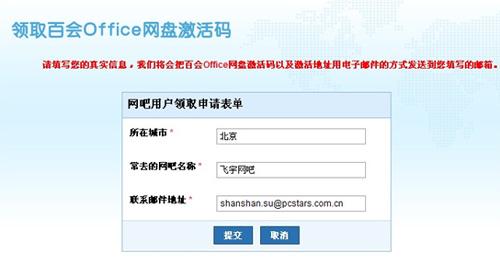 點擊進(jìn)入,按照提示輸入所在地、常去的網(wǎng)吧名稱、聯(lián)系郵箱地址提交后,剩下的工作就是等待百會客服人員將激活碼發(fā)送到所填寫的聯(lián)系郵箱地址。這里需要提醒,填寫的郵箱地址一定要正確,不然就無法正常的接收到百會Office 5G網(wǎng)盤激活碼了。