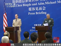 解放軍總參謀長(zhǎng)陳炳德上將11日上午與來(lái)訪的美軍參聯(lián)會(huì)主席邁克爾•馬倫海軍上將舉行會(huì)談后,共同會(huì)見(jiàn)了中外記者。陳炳德指出……