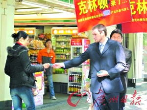 昨日,一位名叫“克林頓”的人在東莞街頭給消費者免費派發(fā)其代言的安全套(見上圖)。不過,這位“克林頓”可不是前美國總統比爾·克林頓,而叫威廉·比利·克林頓,加拿大人。對于商家的宣傳手法,有市民質疑這是借美國前總統克林頓的名字來制造噱頭。(記者 周偉涵 通訊員 黃菲 攝)