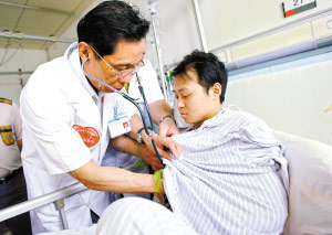 會診完畢,鐘南山專門到災(zāi)區(qū)傷員所在的愛心病區(qū)進行探望。左腿骨折的22歲傷員王濤的心率偏快,鐘南山特地掏出聽診器,在他的病床前俯身為他進行檢查,一邊詢問這個靦腆的年輕人:“在四川住院住了多久?到廣州第幾天了?”