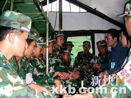 “300名孩子的尸體都堆在學(xué)校。我們就在不遠(yuǎn)處扎營(yíng),晚上夢(mèng)見死去的孩子們?nèi)空酒饋砹顺易哌^來……”戰(zhàn)士小駱流著淚抓住心理救援隊(duì)專家的手訴說著。前日,廣州心理救援隊(duì)來到了廣東公安邊防總隊(duì)某支隊(duì),在帳篷里為115名官兵進(jìn)行心理輔導(dǎo)。“戰(zhàn)士們?cè)诰仍畷r(shí)遇到的問題已經(jīng)超過了他們的承受范圍,他們急需心理輔導(dǎo)!焙蛻(zhàn)士們交流之后的胡慎之醫(yī)生表達(dá)了自己的擔(dān)憂。