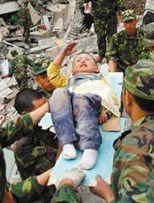 【當(dāng)初】:在地震發(fā)生十余小時(shí)后,一位滿臉是血的男孩終于被武警官兵從廢墟中救出。男孩的左手骨折,一位戰(zhàn)士用木板小心地夾住他的手臂,纏上了繃帶,又慢慢地給男孩喂了一些礦泉水。把男孩放在一塊藍(lán)色的木板上后,武警官兵準(zhǔn)備把他轉(zhuǎn)移到安全地帶,然而,就在這時(shí),令人動容的一幕出現(xiàn)了:年幼的男孩艱難地舉起尚能動彈的右手,虛弱而又標(biāo)準(zhǔn)地敬了一個(gè)少先隊(duì)隊(duì)禮。