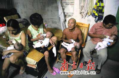 記者隨即前往夏成富的住處了解情況。在一間只有10多平方米的出租屋里,擺著一張雙人床,小夏夫妻和年邁的父母、4個孩子就生活在這個狹小的空間里。4個小寶寶分別被爸爸媽媽和爺爺奶奶抱著喂奶。