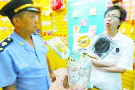 閱讀提示 地地道道的安全套做成了小巧精致的掛件、各種包裝的口香糖、五顏六色的棒棒糖、造型別致的相框、漂亮的小車(chē)飾品,沒(méi)想到,這些另類(lèi)安全套受到了一些未成年人的青睞。昨日,鄭州市工商執(zhí)法人員檢查發(fā)現(xiàn),光彩市場(chǎng)的一家商店銷(xiāo)售的這些另類(lèi)物品涉嫌多種違規(guī),依法實(shí)施暫扣。
