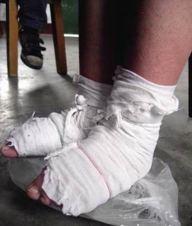 那個(gè)姐姐的死讓黃小紅開始特別注意清潔。每天早上,她都會(huì)先用消過毒、又浸滿氯化鈉生理鹽水的紗布將女兒一雙小腳裹起來,然后背著她,或用自行車載著她來到學(xué)校,再將冰袋放到女兒課桌下,讓她踩在冰袋上上課。中午回家后,又給她重新?lián)Q紗布。下午放學(xué)后,又給女兒雙腳消毒。