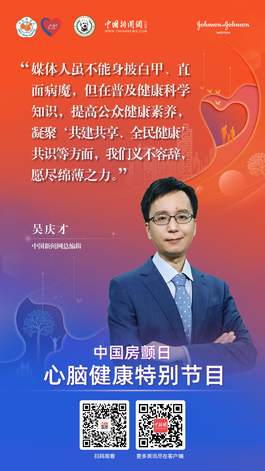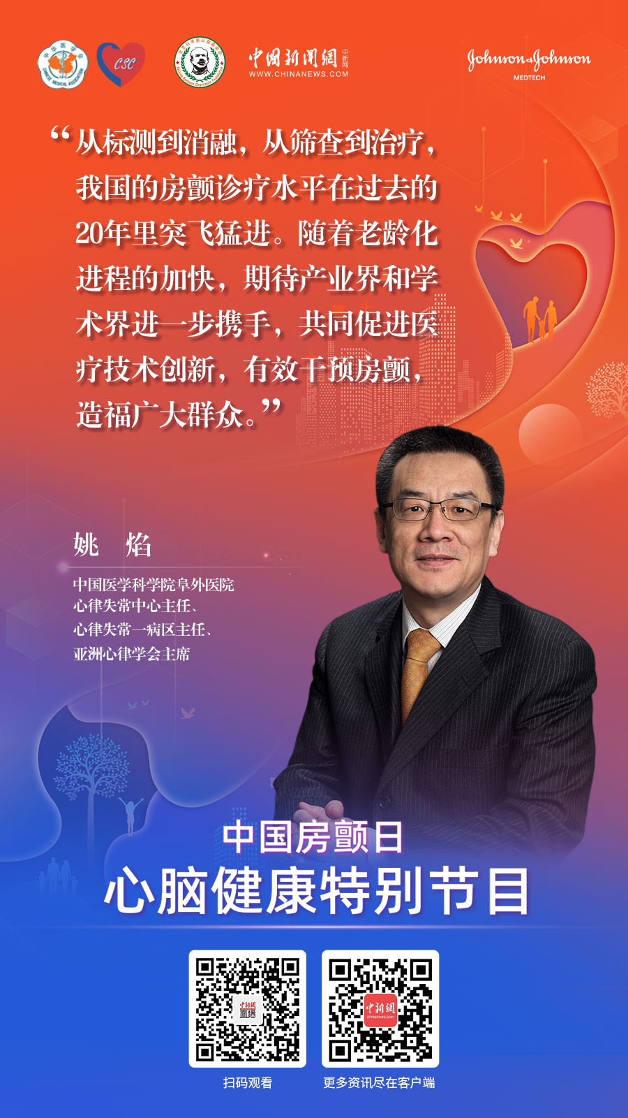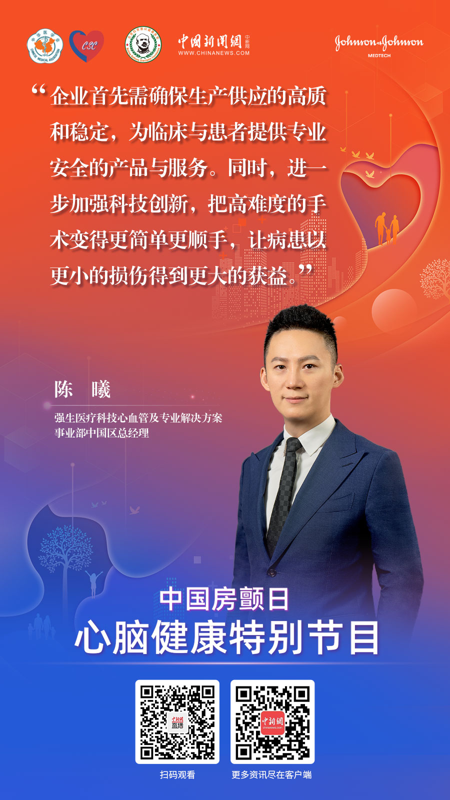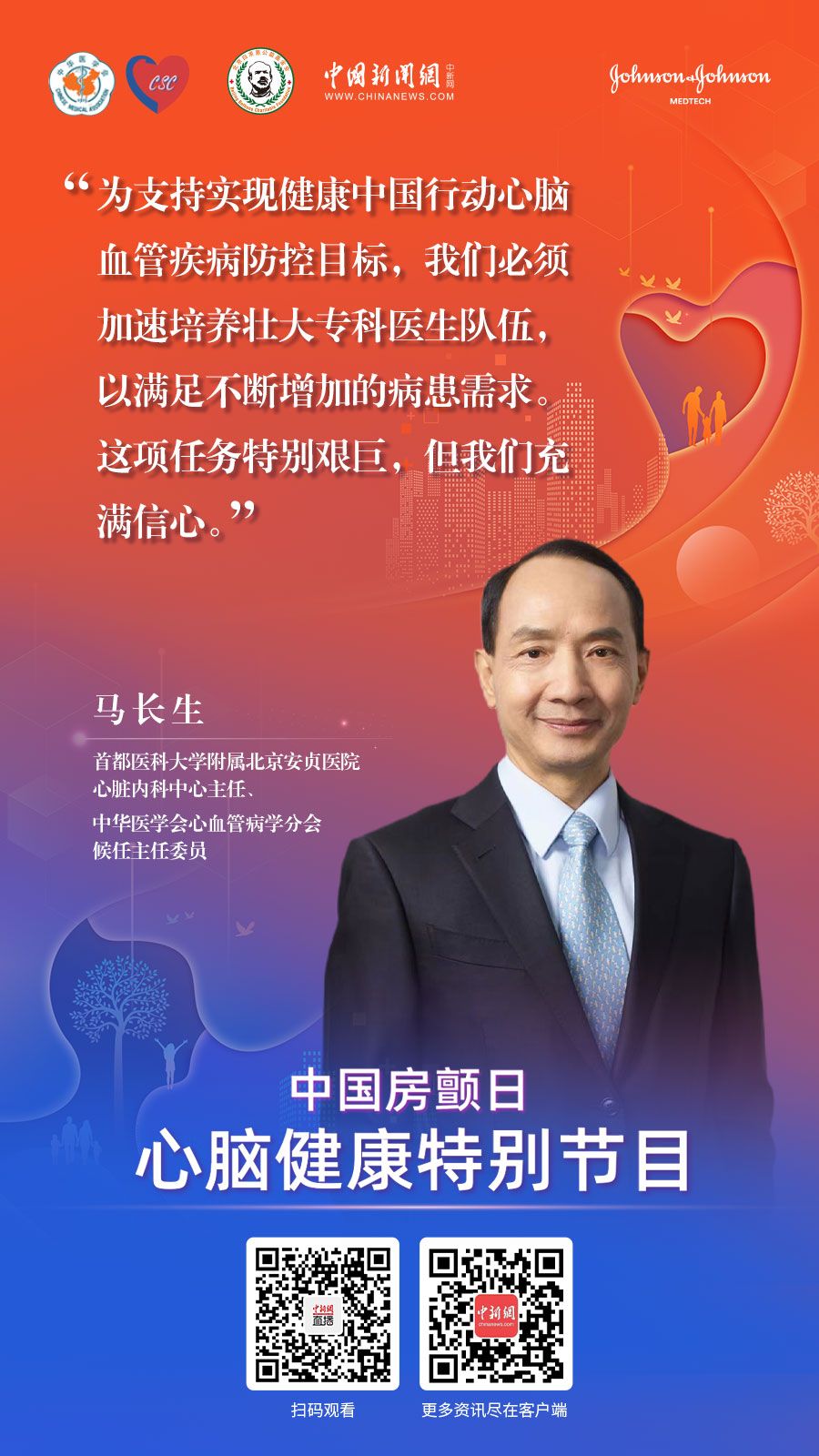 | 7月22日,由中華醫(yī)學(xué)會(huì)心血管病學(xué)分會(huì)、北京白求恩公益基金會(huì)、中國(guó)新聞網(wǎng)聯(lián)合出品,強(qiáng)生醫(yī)療科技支持的《你我同心 星光行動(dòng)》系列微紀(jì)錄片第1集上線。 |