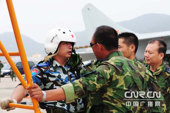 航空兵某師副師長嚴(yán)鋒在飛行前與機(jī)務(wù)人員進(jìn)行交接。