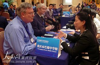 今日(8日)上午,重慶金科大酒店多功能會(huì)議廳內(nèi)人頭攢動(dòng),重慶多所中小學(xué)的校長(zhǎng)及教員在各自展位上擺放好宣傳資料,等待有合作意向的美國(guó)校長(zhǎng)前來(lái)洽談。美方的校長(zhǎng)們?cè)谡刮婚g穿梭,與“相中”的中方學(xué)校展開(kāi)零距離的交流。漢語(yǔ)和英語(yǔ)在會(huì)場(chǎng)內(nèi)交替使用,使得這場(chǎng)中美漢語(yǔ)教學(xué)合作的“雙選會(huì)”氣氛格外熱烈。