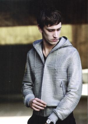把厚重而奢華的鱷魚皮做成一件輕松休閑的連帽衫真是一個令人興奮的主意;疑茏岓w量輕巧起來,溫暖的絨布里子以及與針織面料的無縫縫合技術(shù),讓整件皮衣在細(xì)節(jié)上有了親和力。讓兩種不同的材質(zhì)沒有縫線、不見針腳地縫合在一起,沒有增添任何厚度,是愛馬仕秋冬男裝上的新看點,由此而衍生了一些新面料:鱷魚斜紋織物、澤西水貂皮、薄紗貂皮……