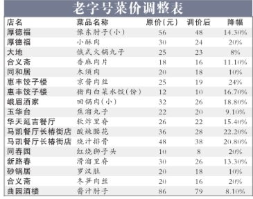他還表示,由于各老字號(hào)在前期原材料價(jià)格上漲時(shí),上調(diào)價(jià)格的幅度各不相同,因此本次菜品價(jià)格下調(diào)幅度也有不同。