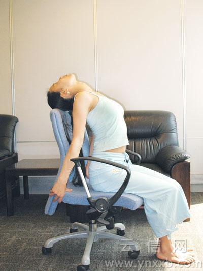 動作要領:坐在椅子二分之一處,雙手向后彎曲,握住椅子背部。身體保持正直,兩肩向后擴展打開,收腹,呼氣上背后仰,胸部盡量向前挺起,頭部放松靠在椅背上,眼睛注視天花板或閉上雙眼,保持此姿勢10秒鐘。