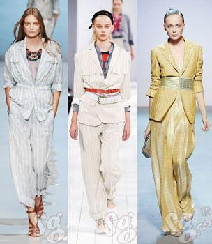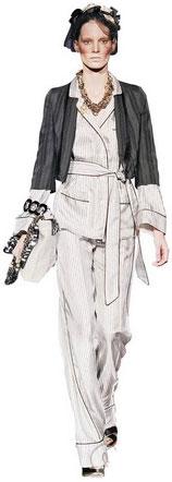 09春夏,Dolce&Gabbana以男式睡衣為靈感,把我們所熟悉的睡衣搬到舞臺(tái)上,經(jīng)過(guò)改良變成時(shí)裝,尤其是褲子結(jié)構(gòu)的創(chuàng)新,這種寬邊褲腳勢(shì)必會(huì)流行于2009年春夏。這個(gè)款式使用具有光澤感和垂感極好的面料,并采用灰白豎條圖案,而這種豎條圖案面料本身就是簡(jiǎn)潔韻味的標(biāo)志性符號(hào)!八绿籽b”外搭一個(gè)黑色小外套,渲染出別具韻味的時(shí)尚氣息,美不勝收。而簡(jiǎn)潔的款式與閃耀的項(xiàng)鏈搭配相得益彰。還有手中的包包配有金屬鏈條具有很強(qiáng)的裝飾感。