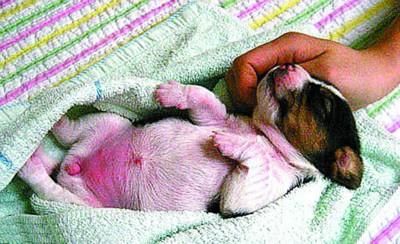 研究小組利用擁有紅熒光蛋白的基因,在2007年12月成功讓代孕母狗產(chǎn)下6條小獵兔犬。其中兩條不幸夭折,但剩余4條都存活了下來。