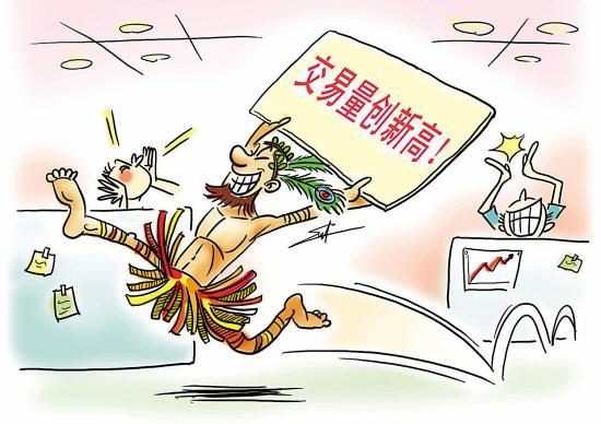 跑到辦公室中間時,這名男子忽然將原本抱在胸前的長方形紙牌翻轉(zhuǎn)過來,高舉過頭頂,上面用超大號的紅字寫著“交易量創(chuàng)新高”。