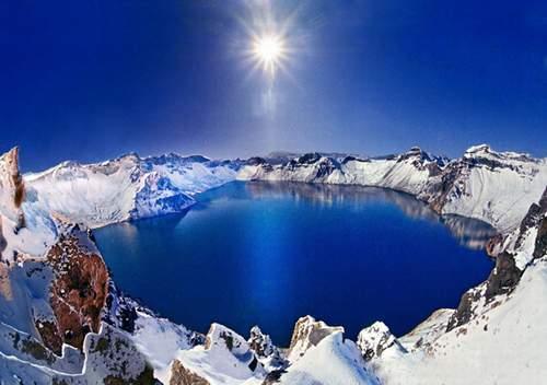 長白山天池又稱白頭山天池,坐落在吉林省東南部,是中國和朝鮮的界湖,湖的北部在吉林省境內(nèi)。長白山系復合式盾形休眠火山,為中國東北和歐亞大陸東部最高峰,是松花江、鴨綠江、圖們江之源。史料記載天池水“冬無冰,夏無萍”,夏無萍是真,冬無冰卻不盡然,冬季冰層一般厚1.2米,且結冰期長達六、七個月。不過,天池內(nèi)還有溫泉多處,形成幾條溫泉帶,長150米,寬30- 40米,水溫常保持在42攝氏度,隆冬時節(jié)熱氣騰騰,冰消雪融,故有人又將天池叫溫涼泊。