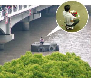 寧波東方熱線、天一論壇5月20日出現(xiàn)多個名為《江廈橋下,上演求愛秀》的帖子,帖子中的照片顯示一男子手捧玫瑰花蹲在江中的防撞墩上。他是怎么下去的?是純粹作秀,還是真情表白?網(wǎng)友發(fā)現(xiàn)后趕緊報警,警方調(diào)查后得知,該男子為向相戀4個月的女友證明自己是多么愛對方,上演了一出瘋狂之舉。他手捧玫瑰花,單手“橫渡”奉化江,游了40多米后,爬上江心的防撞墩,隨后擺出“思想者”等各種造型(下圖)。