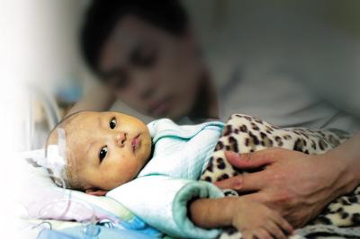 昨日,兒童醫(yī)院內科住院部,5個月大的周舟躺在父親周林的臂彎里記者 孫須 攝