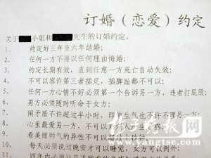 “約定好3年至6年結(jié)婚”、“吃飯前必須默念對方的名字一次”、“任何一方心情不好必須第一個告訴另一方,違者打屁股”、“每天思念對方的時間不可少于3小時,不可多于24小時”……揚(yáng)州大學(xué)大一男生陳翰和在安徽求學(xué)的女友廖倩,近日簽訂了一份《戀愛約定》。端午小長假,陳翰將帶著這份“合約”回家,請家長簽名。