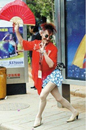 看到有人拍照,他急忙打開(kāi)手中的扇子,不停變換著表情和pose,鏡頭感十足。因?yàn)樘^(guò)專(zhuān)注,“美女”差點(diǎn)從公交站臺(tái)上摔了下來(lái)。因此,他在開(kāi)心當(dāng)“模特”的同時(shí),也不忘提醒被自己完全吸引住的市民:“看得(著)迭(點(diǎn))嘎,小心車(chē)子!”