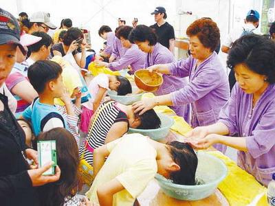 隨后,朋友陪同記者參加慶;顒(dòng),記者看到姑娘們用菖蒲根做成簪子別在頭上,男人們則將菖蒲根纏在腰上。朋友說(shuō),這象征可以防止頭痛和災(zāi)厄的發(fā)生。慶祝活動(dòng)中有很多儀式,孩子用菖蒲水洗頭發(fā),祈求健康;人們點(diǎn)燃許愿燈,祝愿家人平安。來(lái)自農(nóng)村的民俗表演是整個(gè)活動(dòng)中最熱鬧的。小伙子舞動(dòng)繪有龍圖案和寫有“農(nóng)者天下之大樂(lè)”等字樣的大旗,身穿韓服的人們邊敲鼓邊圍成圈跳舞,一些人則裝扮成小丑,穿插在隊(duì)伍里,場(chǎng)面很熱鬧,他們用這種形式表達(dá)豐收的喜悅。朋友說(shuō),端午最有代表性的娛樂(lè)活動(dòng)就是女性聚在一起蕩秋千,男人聚在一起摔跤。端午當(dāng)天,也有將曬干的艾葉放在大門旁邊以除災(zāi)驅(qū)邪的習(xí)俗,韓國(guó)人喝菖蒲酒,還將扇子作為禮物贈(zèng)送,不少商家趁此機(jī)會(huì)熱賣扇子。