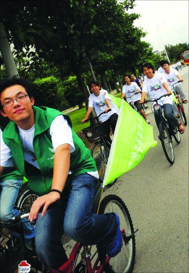 前天,100名大學(xué)生騎自行車(chē)?yán)@大學(xué)城宣傳環(huán)保。本報(bào)記者 馬強(qiáng) 攝