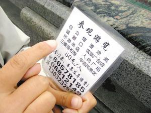“一日游,60塊錢。馬上就可以走。”一名婦女湊上來,還揚起手中的一張紙片,上面印有參觀行程:白公館、渣滓洞、磁器口或湖廣會館、環(huán)游半島、人民廣場、三峽奇石館、華巖風(fēng)景區(qū)(含門票、車費、導(dǎo)游費)。