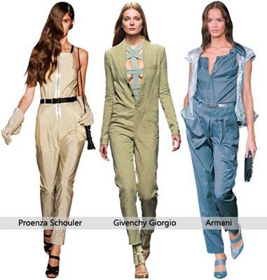 傘兵的制服——連體衣(Jumpsuits),已不僅僅是跳傘時的裝束,這季它成為潮流必備。除了鋪滿女性化的印花,西裝式的剪裁也迎合而上。設(shè)計(jì)師要讓你知道連體衣也能千變?nèi)f化。如果愛時髦,那就穿一條連體衣吧!