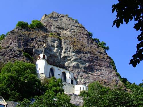 巖石教堂位于德國風(fēng)景優(yōu)美的伊達爾—奧伯施泰因小鎮(zhèn)旁。這里是德國著名的寶石之鄉(xiāng)。走在小鎮(zhèn)的石板路上,記者老遠就看到鎮(zhèn)外山上巖石峭壁上的白色小教堂。