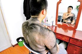 炎熱的夏天,23歲的小宋還穿著長(zhǎng)袖衣服,熱得滿頭大汗。“不是我不怕熱,我是怕別人看到我身上的黑色‘毛坎肩’,又對(duì)我指指點(diǎn)點(diǎn)!毙∷慰谥械拿布,其實(shí)是已經(jīng)伴隨了他20多年的黑毛胎記。