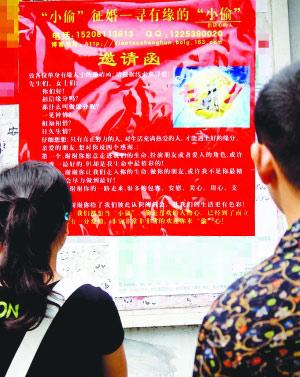 這張大紅海報十分喜慶,上貼一張七夕圓月牛郎織女相會圖,留下征婚者的電話號碼、QQ號碼及網(wǎng)絡(luò)博客地址,另有一些真情話語。乍一看,這“小偷”征婚還真蒙混人,可走近一瞧,才發(fā)現(xiàn)標(biāo)題上的“小偷”下面有五個小字注釋:指偷心的人。