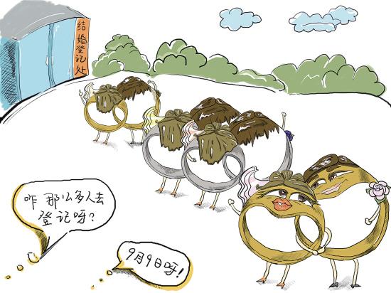 今天是2009年9月9日,成為眾多年輕人喜定終身大事的好日子。不少年輕男女選在今天去登記結(jié)婚,有的選在今天大擺喜宴……他們看中的是這個(gè)日子里蘊(yùn)含的百年一遇的“久久久”好彩頭。民俗專家解釋說,2009年9月9日,因諧音讀起來像“愛你久久久”,吸引了許多年輕人選擇在今天喜結(jié)良緣,祈求婚姻長久。這一現(xiàn)象源于古人對(duì)數(shù)字的崇拜,現(xiàn)在人們利用漢字之間的諧音,以祈福表達(dá)良好祝福。