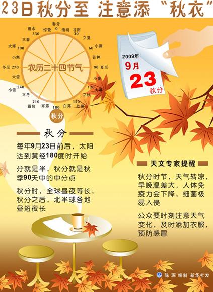 23日將迎來農(nóng)歷二十四節(jié)氣的“秋分”。天文專家提醒,隨著秋分節(jié)氣的到來,氣溫降低的速度將明顯加快,公眾要準備好換季的秋裝。