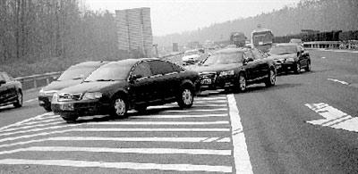 10時30分許,在京港澳高速公路695公里東半幅,18輛清一色的奧迪轎車一字排開向北行進(jìn)。突然,領(lǐng)頭轎車踩起剎車,從行車道兜到超車道上,隨即向右猛拐。它身后一長串轎車也接連紛紛拐彎,形成約30米長的半圓形,東半幅公路立即被堵死。此時,車隊身后300米范圍內(nèi)至少有4輛大卡車和轎車,剎車聲立即響成一片。