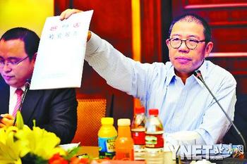 農(nóng)夫山泉董事長鐘睒睒昨表示對復(fù)檢“不予認(rèn)同”。圖為11月30日鐘睒睒展示有關(guān)部門的檢驗(yàn)報告-供圖/新華
