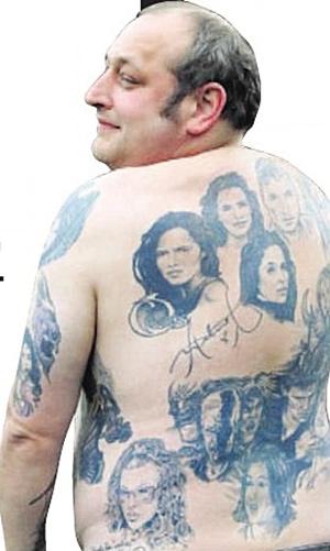 據(jù)英國媒體9日?qǐng)?bào)道,英國41歲男子斯蒂夫·波特(右圖)堪稱是一名“超級(jí)追星族”,在過去10來年中,他將自己最喜愛的24名歐美影星和搖滾歌星的頭像都文在了自己的前胸、后背、臂膀以及大腿上。其中的12個(gè)明星還在波特的身體皮膚上留下了各自的親筆簽名。每當(dāng)一個(gè)明星用筆在波特的皮膚上簽名后,波特就會(huì)立即趕往一個(gè)文身藝術(shù)家的工作室中,請(qǐng)文身藝術(shù)家將他最新得到的名人簽名也永久性地文在他的皮膚上。據(jù)悉,波特目前計(jì)劃申請(qǐng)吉尼斯世界紀(jì)錄。