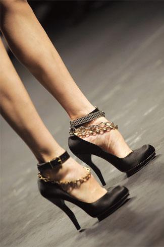 不景氣時期,女人的鞋跟似乎會變高,很顯然,本季天馬行空的鞋形正是對經濟蕭條的一種藐視。然而關于高跟鞋究竟象征著女權還是男權的爭論已經持續(xù)了幾十年,時尚史學家Giorgio Riello 與Peter McNeil 在《鞋子:從涼鞋到球鞋的歷史》一書中指出,1920 年代的婦女參政多以穿高跟鞋來展現(xiàn)女性特質,她們穿著鈕扣靴和高跟運動鞋向世人證明,參政并不會抹煞女人味。