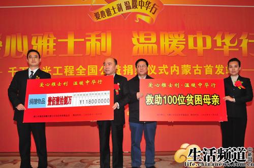 江南綠樹成蔭,塞北已然雪舞。一場面向全國范圍內(nèi)的“愛心雅士利,溫暖中華行” 千萬陽光工程全國公益捐贈系列活動11月10日上午首站內(nèi)蒙古。在呼和浩特市當(dāng)天舉辦的捐助發(fā)放儀式上,國內(nèi)知名奶粉企業(yè)雅士利集團(tuán)攜手中華慈善國際互聯(lián)網(wǎng)救助中心、內(nèi)蒙古扶貧基金會,將捐贈物資發(fā)放到亟需幫助的兒童福利院與貧困小學(xué)。內(nèi)蒙古自治區(qū)扶貧辦黨組成員副主任馮有恩、黨組成員副主任杜古、黨組成員紀(jì)檢組長甄小兵及內(nèi)蒙古扶貧辦機(jī)關(guān)各處室及事業(yè)單位的主要領(lǐng)導(dǎo)出席了活動。來自新華社內(nèi)蒙古分社、內(nèi)蒙古電視臺、呼和浩特電視臺、呼和浩特電臺、《內(nèi)蒙古日報(bào)》、《內(nèi)蒙古晨報(bào)》、《北方新報(bào)》、《北方家庭報(bào)》、《呼和浩特日報(bào)》、《乳業(yè)時(shí)報(bào)》、《香港商報(bào)》和《法制與社會雜志》等媒體記者共同見證捐助發(fā)放儀式。