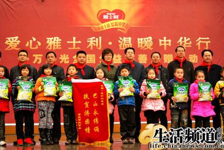 “愛心雅士利 溫暖中華行”千萬陽光工程全國公益捐贈活動,由國務院扶貧辦、中國扶貧開發(fā)協(xié)會、《中國扶貧》雜志社及中華慈善國際互聯(lián)網(wǎng)救助中心主辦,廣東雅士利集團股份有限公司承辦,全國各省、市、自治區(qū)、直轄市公益慈善機構(gòu)共同參與。遠赴重慶潼南縣的他們,為這里的孩子帶來他們需要的奶粉、學習用品等,用這些點滴愛心,伴隨他們健康成長。重慶電視臺、《重慶日報》、《重慶晨報》、《重慶商報》、《重慶時報》、潼南電視臺、《潼南報》等媒體記者也到場進行采訪報道。