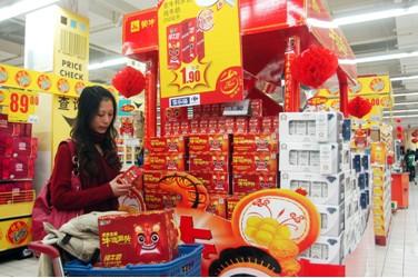 2月6日下午,記者來(lái)到雙井的一家超市,這里的蒙牛“牛運(yùn)金虎”牛奶的銷(xiāo)售區(qū)也是人頭攢動(dòng),一位女士和老公在在貨架前仔細(xì)挑選。據(jù)這位女士介紹,她買(mǎi)牛奶是想送人,所以對(duì)產(chǎn)品品質(zhì)和包裝要求的比較高。當(dāng)他們看到蒙牛牛奶上這只喜氣洋洋的小金虎,覺(jué)得特別可愛(ài)也很喜慶,大紅的禮盒包裝、包裝上小老虎頭上的“!弊趾汀芭_\(yùn)當(dāng)頭”的寓意甚合他們的心意。