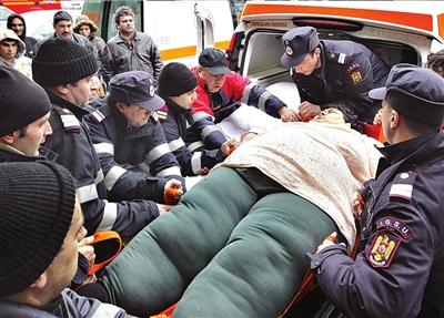 維多利亞17日抵達(dá)布加勒斯特大學(xué)附屬醫(yī)院后,人們用擔(dān)架將她抬下。圖/人民圖片
